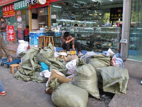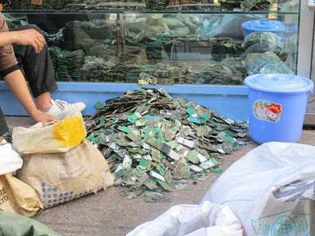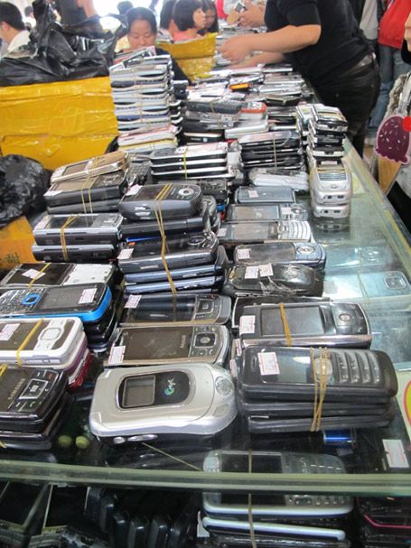 在华强北商业区的一个隐蔽角落里有两座高大的建筑物,在那里面的人们主要进行着手机回收的工作。一位企业家告诉我,他在一个批发商那成批购买这些手机,而那位批发商则主要从香港和另一个亚洲主要城市的垃圾堆中拾得废旧手机。