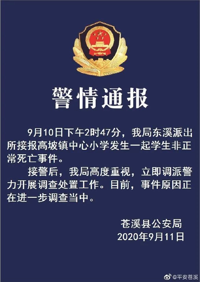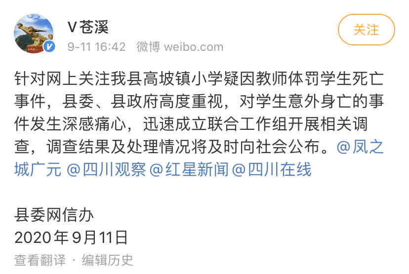 9月11日,据@V苍溪消息:针对网上关注我县高坡镇小学疑因教师体罚学生死亡事件,县委、县政府高度重视,对学生意外身亡的事件发生深感痛心,迅速成立联合工作组开展相关调查,调查结果及处理情况将及时向社会公布。